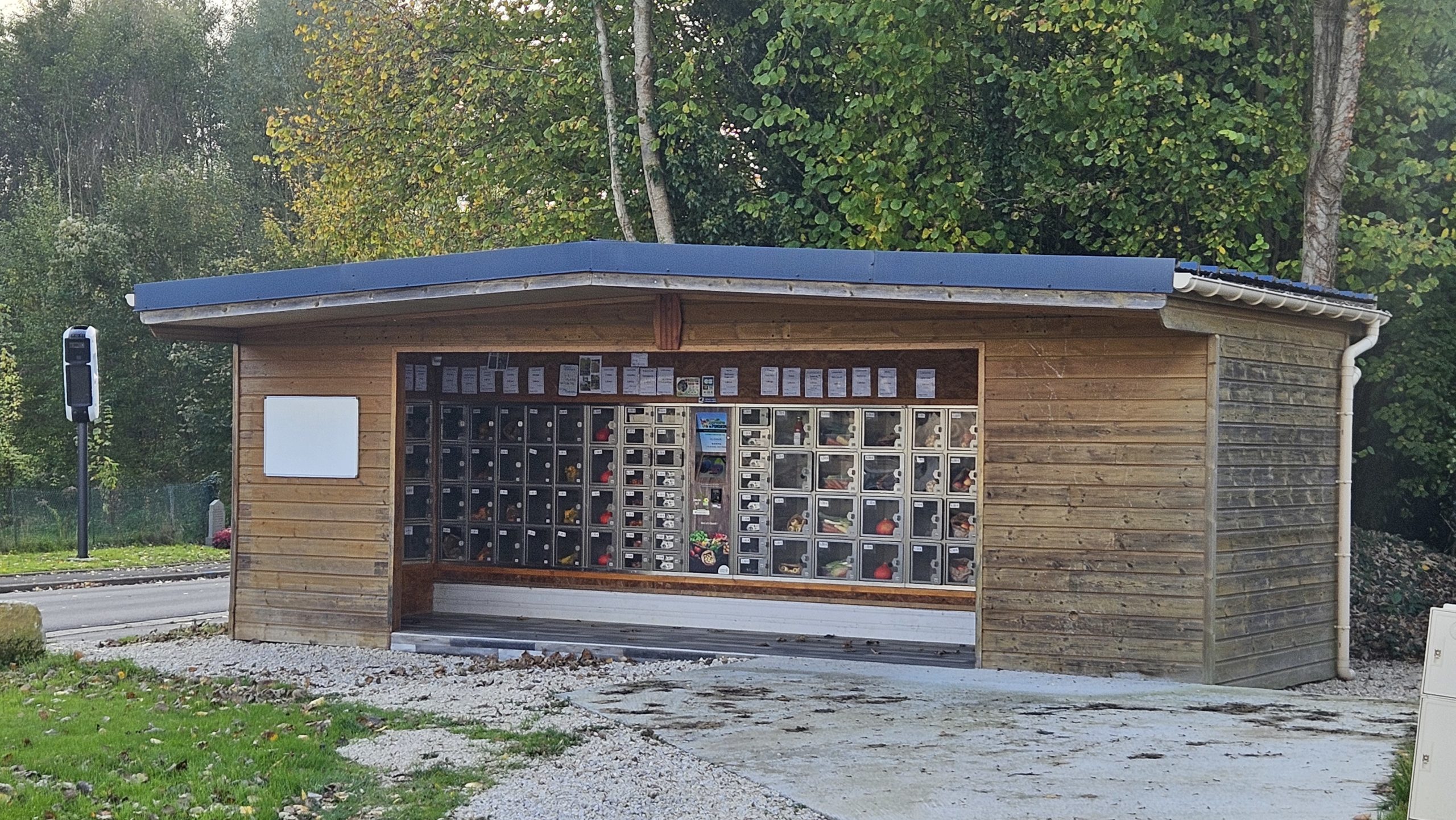 Distributeur de LégumesApprovisionné plusieurs fois par jour : des légumes et des fruits de saison, des Œufs, des soupes. Le distributeur est situé près du feu tricolore, rue des peupliers. |