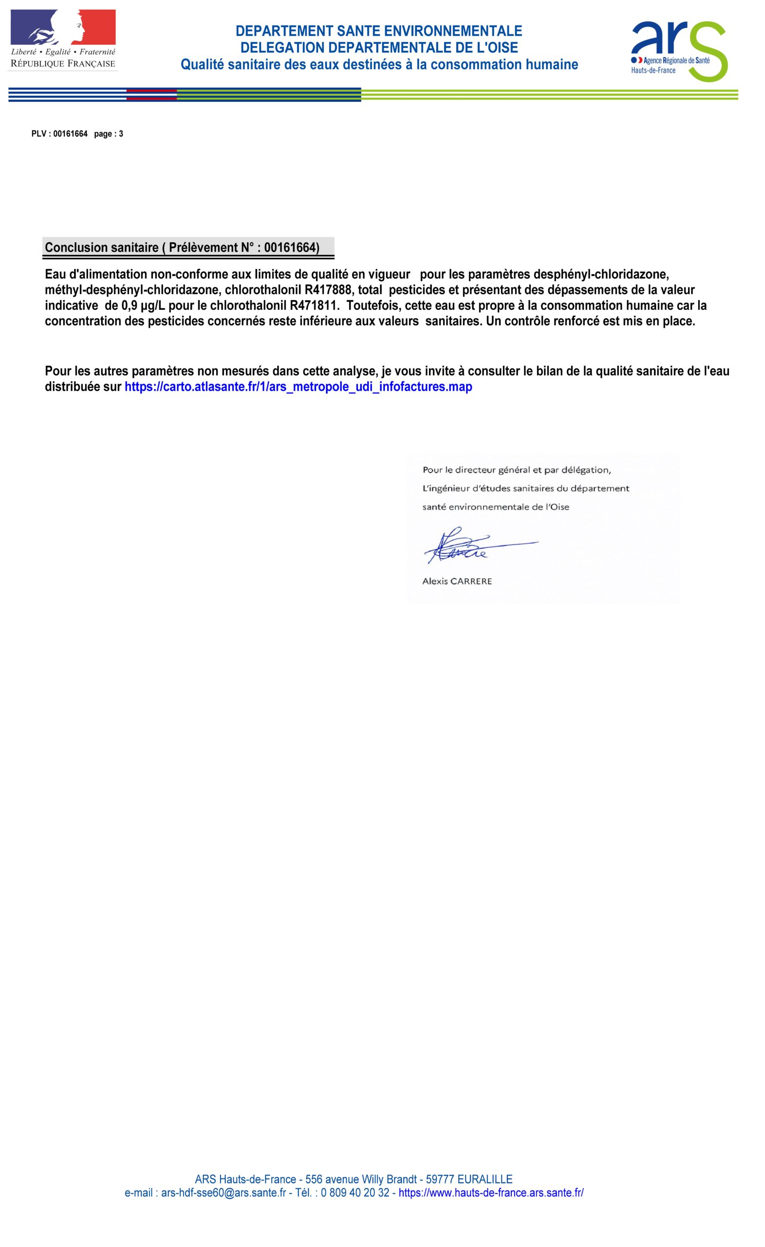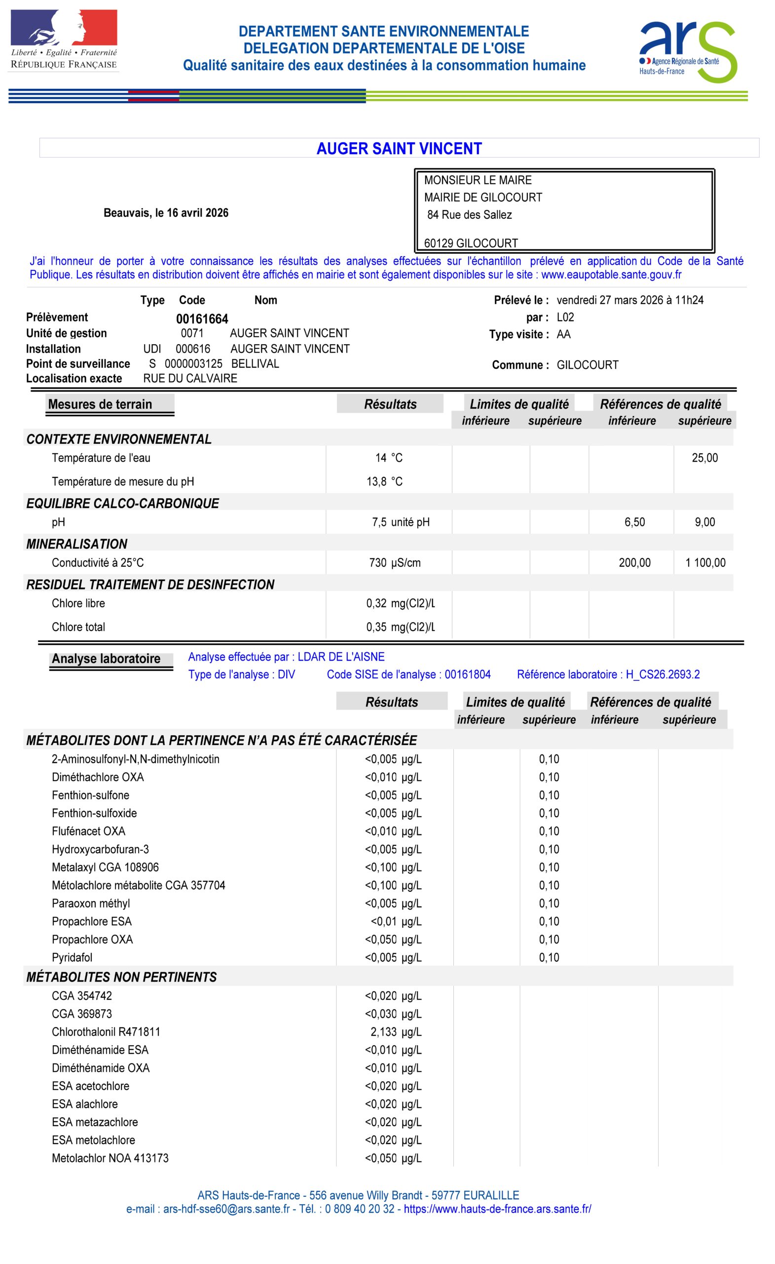 Notre ARS (Agence Régionale de Santé) a effectué à BELLIVAL un deuxième prélèvement d’eau du robinet le 27 mars 2026.