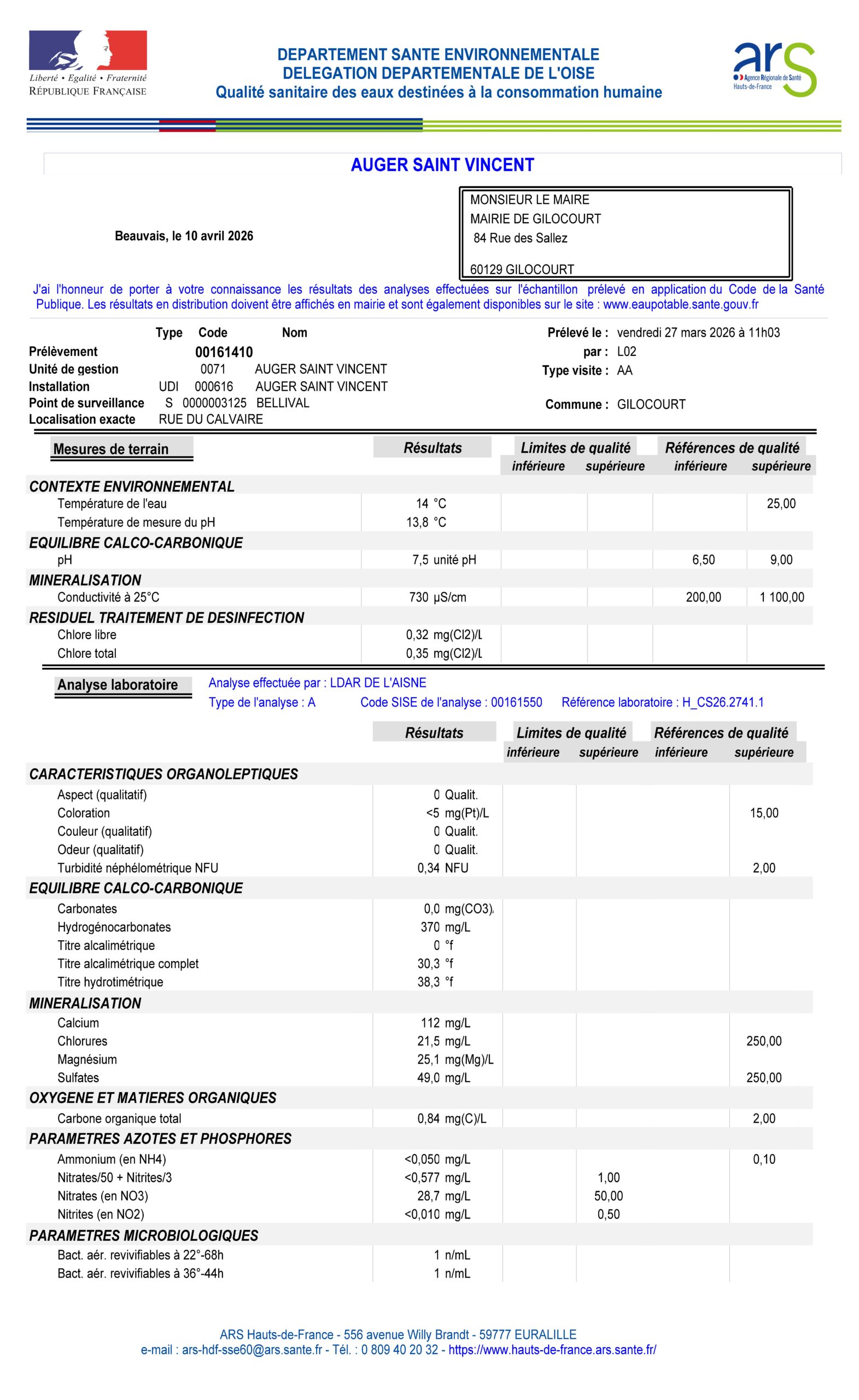 Notre ARS (Agence Régionale de Santé) a effectué à BELLIVAL un prélèvement d’eau du robinet le 27 mars 2026.